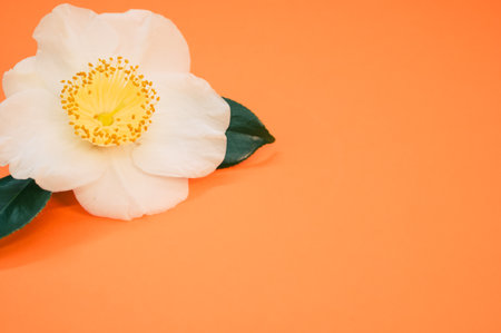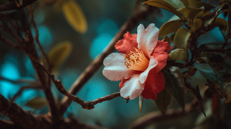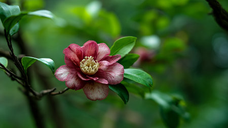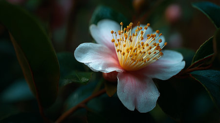 Delicate Camellia Flower with Lush Green Foliage in Natural Light