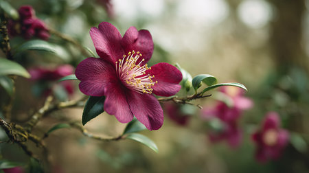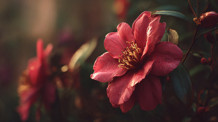 Delicate Camellia Blossom with Vibrant Red Petals in Natural Light