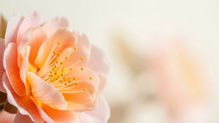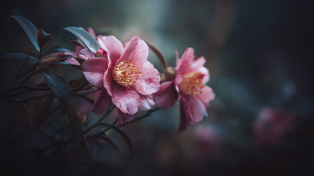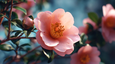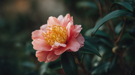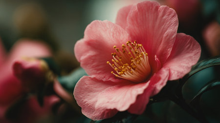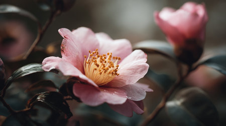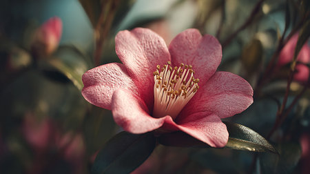 Graceful pink camellia blossom with elegant stamen display in soft light
