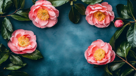 Pink camellia flowers and glossy green leaves arranged on a textured blue background, forming a natural frame with copy space