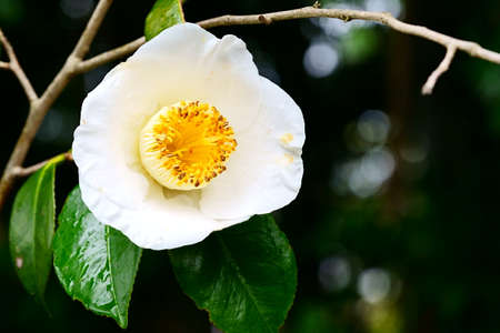 Beautiful Camellia Flower with Dew Drops on Leaves in Garden