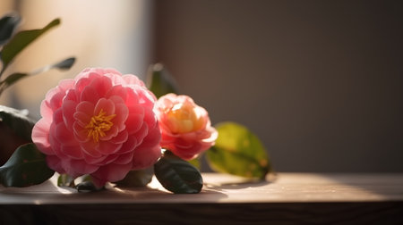 Delicate Camellia Flowers Dazzle with Dewdrops in the Sunlight
