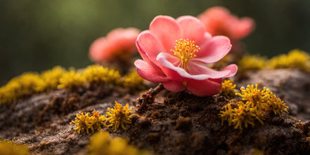 A delicate pink flower with yellow stamens is beautifully displayed on a rustic, textured branch. Bokeh background adds soft depth.