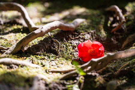 Red Camellia flower petals on a green moss ground in the forest. Shallow depth of field.