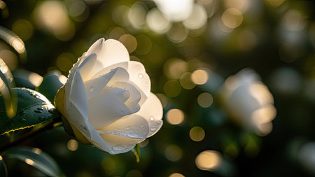 A close-up captures a pristine white flower with subtle textures and water droplets. The soft focus background features blurred green foliage and golden bokeh, creating a dreamy effect. The image uses natural lighting, suggestive of a garden environment, potentially suitable for botanical illustrations or decorative designs.