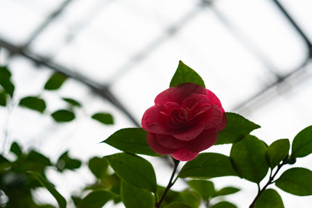 Camellia japonica. Vibrant red rose blossom amidst lush green foliage