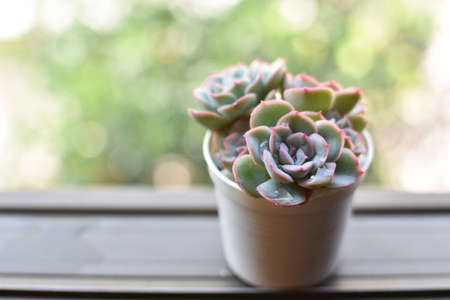 Household aromatic and plants succulents in pot on the window. Succulents in a white mini pots home decorative ideas.