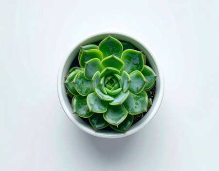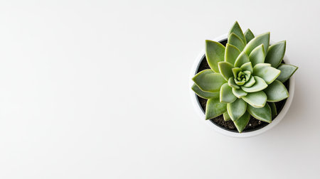 Succulent plant in pot on white background. Top view. Promoting plant care.