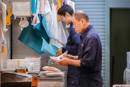 TOKYO, JAPAN - NOVEMBER 25 Tsukiji fish market in Tokyo, Japan on November 25, 2013 Unidentified japanese workers pack the food before distributing to customer