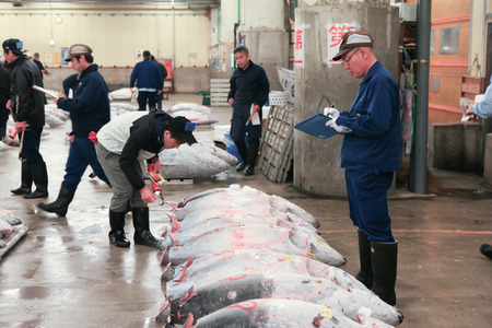 Famous Tuna auction at Tsukiji fish market. Tsukiji is the biggest fish market in the world