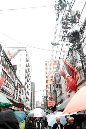 Osaka, Japan - Oct 25: People shopping in a fresh food market in Osaka, Japan on Oct 25, 2014. The market offers a wide range of food, including seafood, vegetables and fruits.