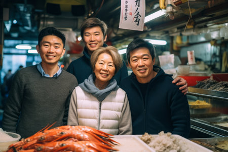 Experience the vibrant atmosphere of a traditional Japanese fish market where chefs skillfully prepare fresh seafood amidst colorful displays and local charm.