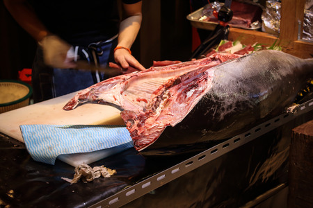 Osaka, Japan - Oct 26: People watching the cutting of a giant tuna in a seafood store in Kuromon Market in Osaka, Japan on Oct 26, 2014.