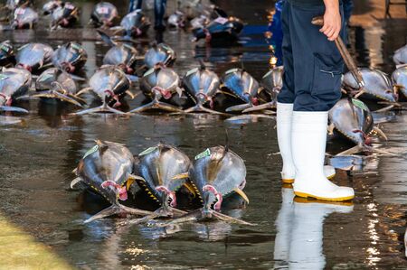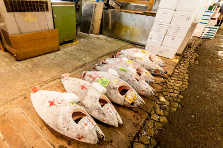 Tokyo, Japan - January 15, 2010: Early morning at Tsukiji Fish Market. Tuna is ready for auction.