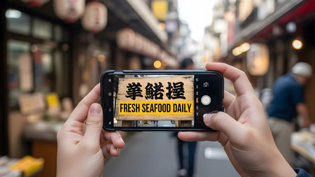 Hands hold smartphone capturing a wooden sign with Japanese text and FRESH SEAFOOD DAILY