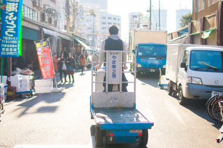 TOKYO, JAPAN - November, 22, 2014: A man driving taretto, motorized cargo cart, at , the biggest fish and seafood market in the world.