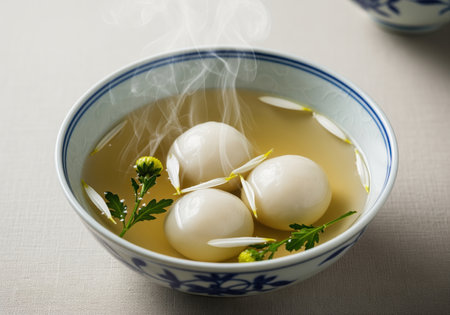 Three glutinous rice dumplings tangyuan floating in hot, clear, sweet soup, garnished with delicate chrysanthemum petals, served in a traditional ceramic bowl. represents asian cuisine, dessert, and tradition.