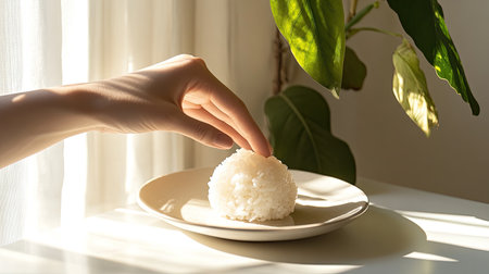 A hand gently reaches for a perfectly shaped ball of rice on a white plate, showcasing a serene dining setting complemented by a vibrant green plant bathed in soft sunlight.