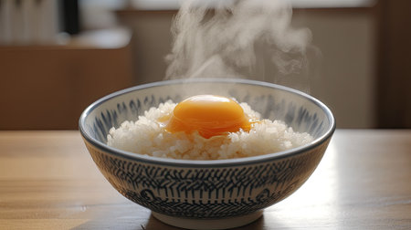 A bowl of tamago kake gohan with a half-broken raw egg yolk, steam rising gently from the hot rice, placed on a wooden table