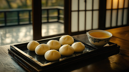A tray of freshly steamed Chinese custard buns, served with a cup of hot jasmine tea in a teahouse setting.