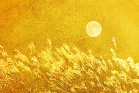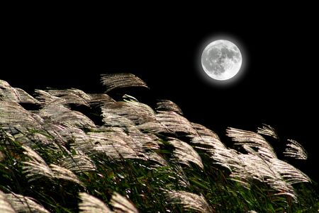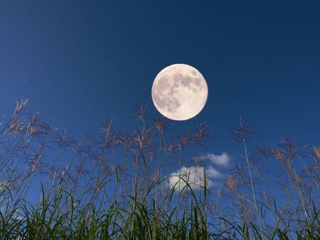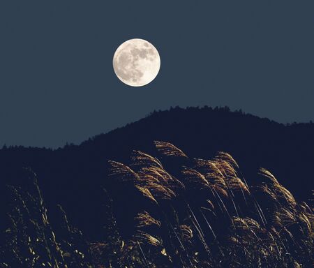 A full, glowing moon is visible through silhouetted tall grass stalks in a muted twilight sky.