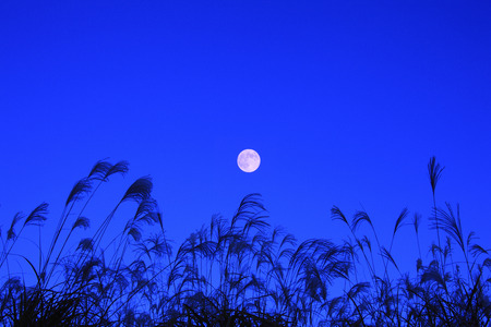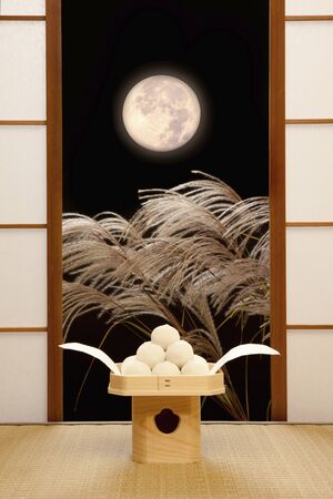 Tsukimi moon viewing with pampas grass and rice dumplings on traditional Japanese veranda