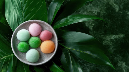 Rainbow mochi scoops in ceramic bowl, set against leaves and blossoms for an elegant composition