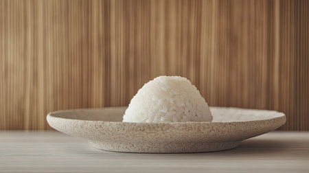 A beautifully arranged round shape of white rice placed on a textured plate, set against a wooden backdrop, perfect for food photography and culinary art.
