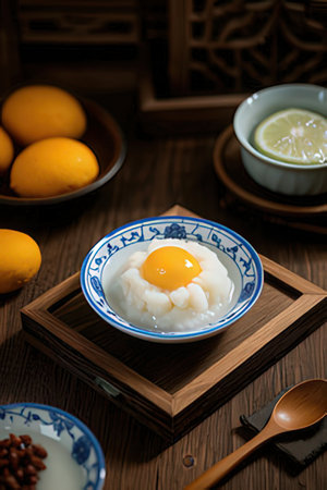 Minimalist top-down view of tamago kake gohan, egg yolk centered perfectly on rice, surrounded by Japanese breakfast elements