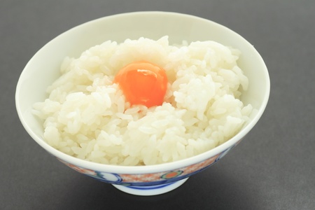 Tamago kake gohan in a ceramic bowl, raw egg yolk resting on steamed rice, surrounded by side dishes of miso soup and natto