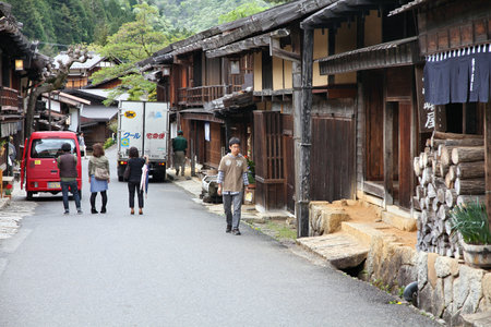 TSUMAGO, JAPAN - MAY 2, 2012: People visit old town of Tsumago. Tsumago-juku was a historic post town of famous Nakasendo Kiso valley trail between Kyoto and Edo.