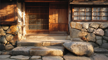 Experience the serene beauty of traditional Japanese architecture featuring a wooden entrance and a stone pathway, bathed in warm evening light.