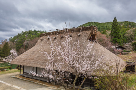 Traditional Japanese farmhouse with thatched roof in spring. Plum blossoms in full bloom. Shirakawa-go, Gifu Prefecture, Japan.
