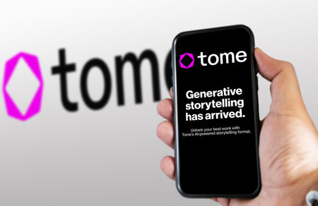 San Francisco US, March 2023: hand holding a phone with Tome website on the screen. Tome is an AI-powered storytelling format. Illustrative editorial