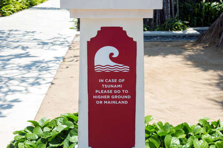 Tsunami roadsign pointing towards the stunami evacuation route, escape plam in Indonesia Bali