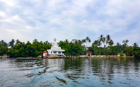 Large white Buddha statue in Bentota Udakotuwa Temple at Bentota Ganga in Bentota Beach Galle District Southern Province Sri Lanka.