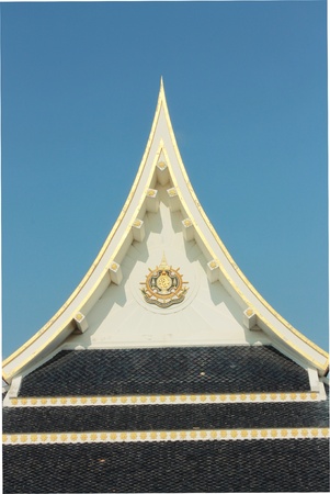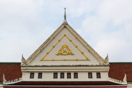 Religious building with a triangular roof on blue sky with red decor. Ayutthaya Thailand.