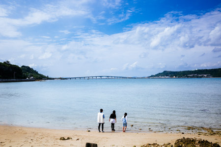 Okinawa, Japan - July 2024 : Long bridge of Kouri Island and beach from high view by drone with clear sky and sea water.