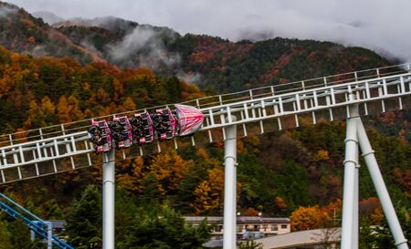 YAMANASHI, JAPAN - NOVEMBER 24,2019: Unidentified fun people riding car on Roller coaster railway with Mount Fuji view and clear blue sky at Fuji-Q Highland amusement park in autumn.