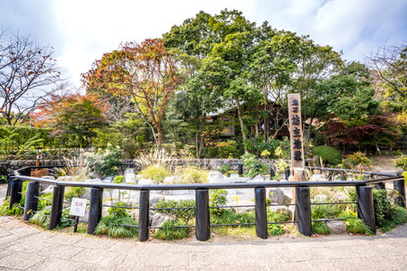 Oniishibozu Jigoku (Ghost Rock Monk Hell) pond in autumn, which is one of the famous natural hot springs viewpoint, representing the various hells in Beppu, the Japanese means