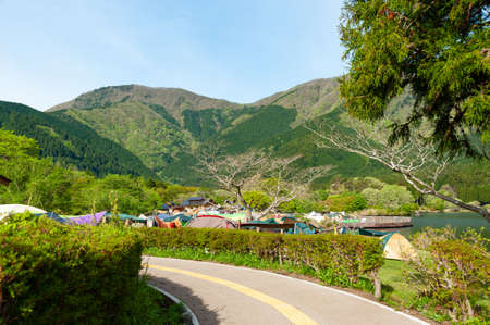 Camping Tents in Fuji-Hakone-Izu National Park. Lake Tanuki Campground in Fujinomiya City, Shizuoka Prefecture, Japan.