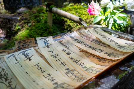 Traditional omikuji fortunes submerged in a stone fountain at Mitaki-Dera in Hiroshima, surrounded by moss, bamboo, and flowers
