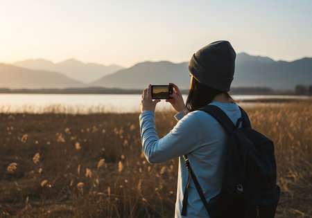 A woman with long dark hair, wearing a gray beanie and dark jacket, takes a photo of a beautiful sunset over a lake with a smartphone. Generative Ai