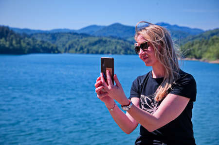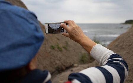 Take a mobile picture on your phone seashore. Female hands hold the phone and take pictures. Travel photography.
