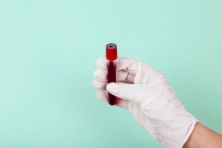 Blood positive test to coronavirus. Medical reseach, test-tube with blood, hand in latex medical gloves. Coronavirus outbreak and influenza. 2019-nCoV, covid-19, sars. High quality photo