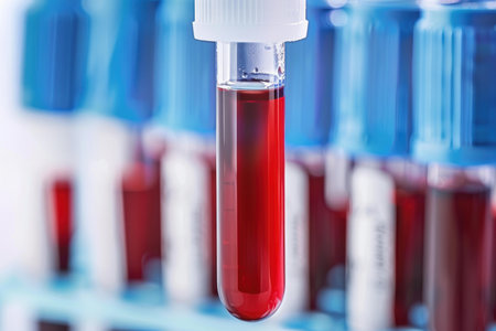 Test tube containing a blood sample is hanging in a medical research lab over other test tubes
