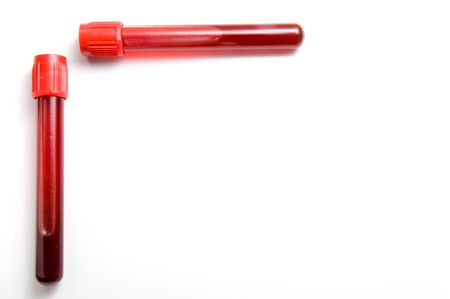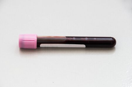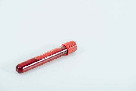 Macro blood sample in test tube on white background. Epidemic Mers-CoV Coronavirus researching and treatment concept