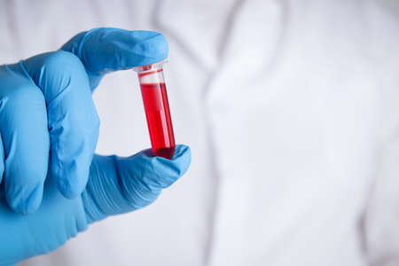 Hand holds a test tube containing a blood negative sample, test tube with blood for Covid-19 (coronavirus) analyzing. Laboratory testing patient's blood. Blue nitrile glove.