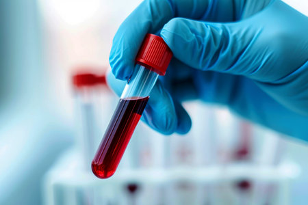 A hand wearing a white glove and lab coat holds a blood sample tube with a red cap on a green background.