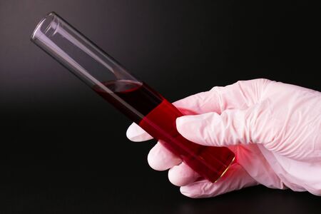 Test tube with a blood test on the hand of a medical worker on a black background.